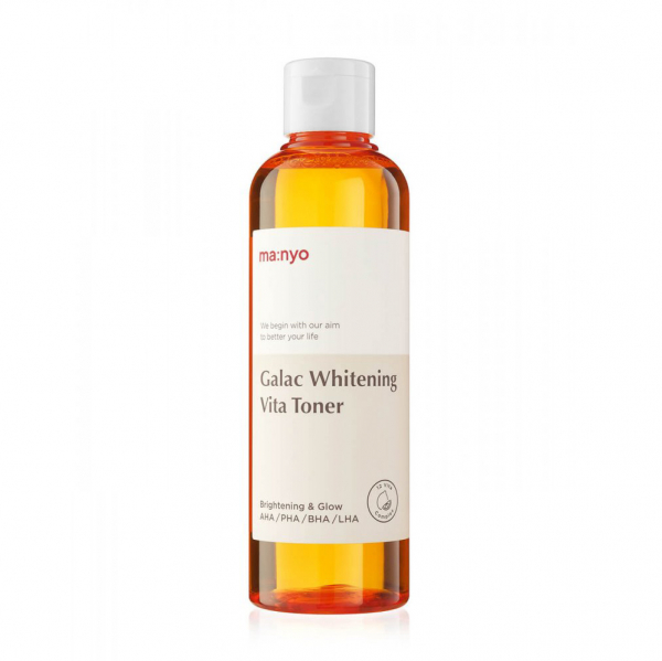 Осветляющий тонер Manyo Factory Galac Whitening Vita Toner Средство мягко отшелушивает ороговевшие частички и бережно увлажняет кожу. Кислоты в составе проникают глубоко в кожу и буквально растворяют загрязнения и остатки себума. Галактомисис замедляет выработку меланина, заметно осветляет пигментацию и следы от акне. Витамины борются с тусклостью. Спустя пару недель использования вы заметите, что неровности на коже исчезли, а лицо получило свежий отдохнувший вид.