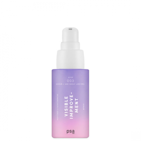 Сыворотка visible improvement от PSA содержит в себе комбинацию 10% ниацинамида и 10% комплекса пептидов (Tripeptide-38, Tripeptide-1, Tetrapeptide-7), которые обеспечивают сужение пор и осветление кожи за счёт ницинамида в составе, в то время как пептиды увеличивают синтез коллагена и эластина , что в свою очередь ведёт к восстановлению кожи и является анти-эйдж защитой.