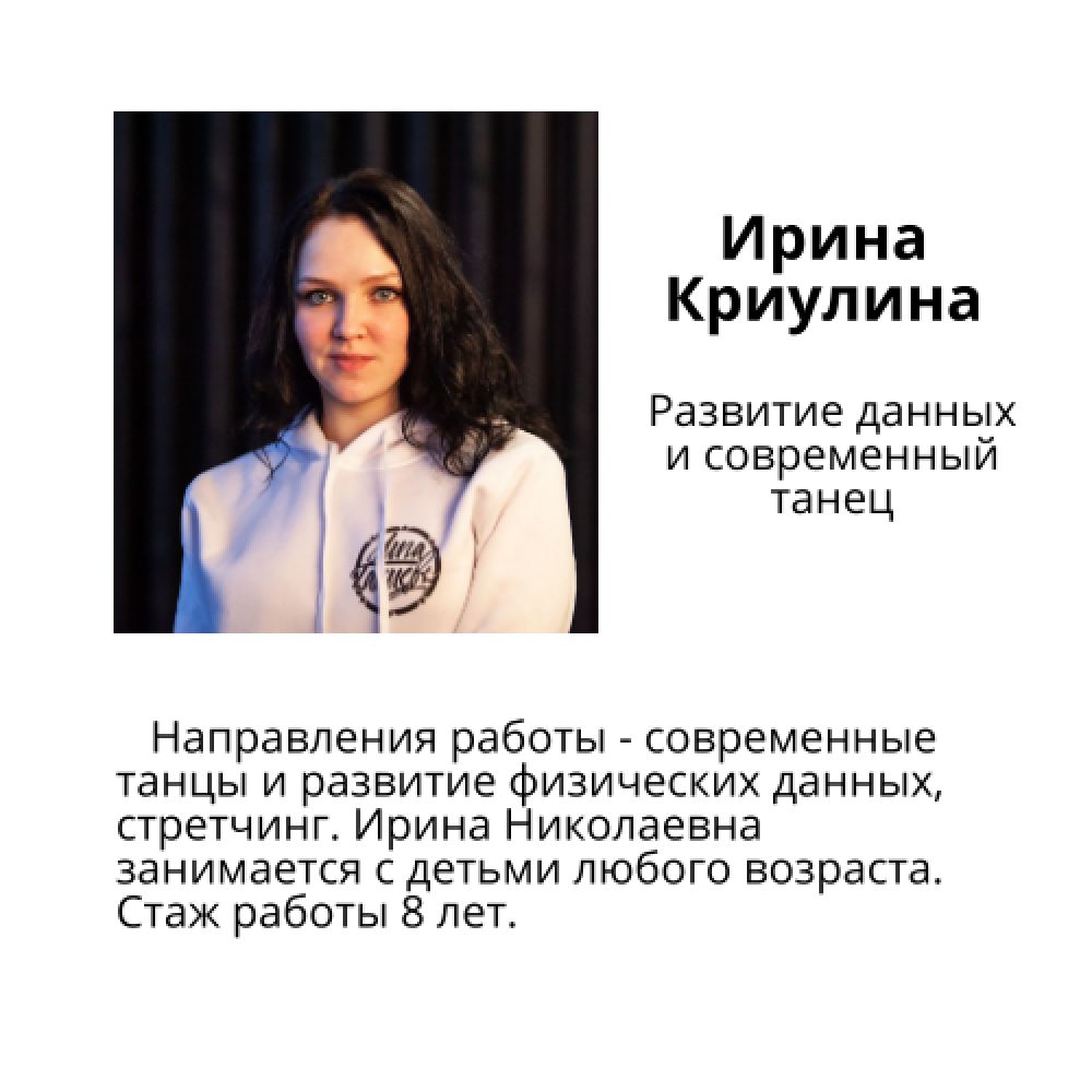 Детский танец, ритмика, развитие физических данных ребенка, современная хореография, уличный танец, джаз... — за каждой дисциплиной стоят специалисты с многолетним опытом.