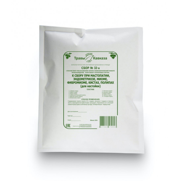 Богатый корневой состав сбора трав № 32-а при мастопатии, эндометриозе, миоме, фибромиоме, кистах, полипах (для настойки), 150 гр. обеспечивает прекращение роста опухолевых клеток, их уничтожение и выведение из организма: лопух, красная щетка, копеечник, бадан, солодка, лапчатка, змеевик, дягиль, солодка. Фитогормоны: красная щетка. Сбор имеет высокоэффективный обширный химический состав.