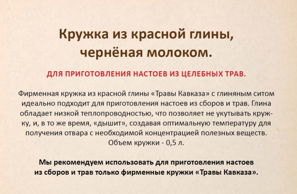 Мы рекомендуем использовать для приготовления настоев из сборов и трав только фирменные кружки "Травы Кавказа".