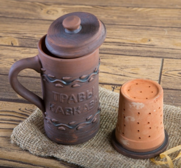 Фирменная кружка из красной глины "Травы Кавказа" с глиняным ситом идеально подходит для приготовления настоев из сборов и трав. Глина обладает низкой теплопроводностью, что позволяет не укутывать кружку, и, в то же время, "дышит", создавая оптимальную температуру для получения отвара с необходимой концентрацией полезных веществ. Объем кружки - 0,5 л.