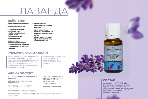 ДЕЙСТВИЕ: Эфирное масло лаванды обладает противовоспалительными и антиоксидантными свойствами, оказывает балансирующее действие на сальные железы, освежает, способствует глубокому обновлению кожных покровов. Помогает избавиться от прыщей и акне, ощущения стянутости и раздражения, хорошо тонизирует кожу. Рекомендуется в качестве превентивной меры при облысении. Восстанавливает поврежденную структуру и укрепляет стержни волос, хорошо очищает перхоть.