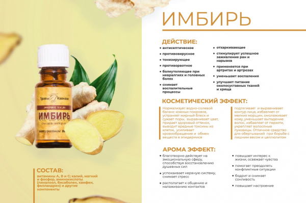 ДЕЙСТВИЕ: Взаимодействуя с кожей, имбирь оказывает стимулирующее действие, улучшает кровообращение, оказывает омолаживающий эффект, способствует очистке и сокращению пор и останавливает воспалительные процессы разной природы возникновения, повышает тонус верхних слоев эпидермиса, нормализует водный баланс кожи, имеет антигерпетическое действие. При добавлении эфирного масла имбиря в средства по уходу за волосами улучшается питание корней волос, происходит их укрепление. Имеет согревающее и увлажняющее действие, благодаря чему эффективно используется в антицеллюлитных программах, а также для лечения рубцов и предотвра-щения появления растяжек (стрий).