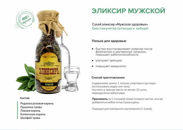 Состав: Грушанка (трава), Копеечник южно-сибирский (красный корень), Левзея сафлоровидная (маралий корень), Родиола розовая (золотой корень), Шалфей лекарственный (листья).